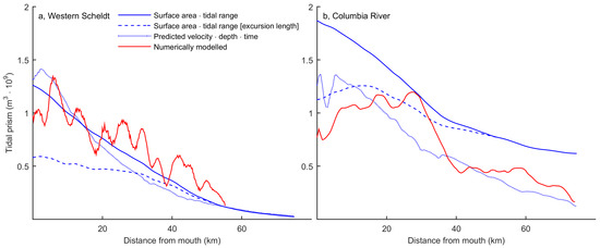 Therefore, an alternative approach for calculating flow velocities was based on the local tidal prism and the cross-sectional channel geometry, i.e., continuity. For each cross-section, a typical velocity is calculated at the average depth of the cross-section (i.e., ). Nevertheless, the quality of these predictions appeared to be less (Figure 9) for two reasons: (1) at the upstream boundary, velocities are mainly sensitive to river discharge. Here, local tidal prism approaches river discharge because it is obtained from integrating over the distance of a tidal excursion length upstream (Equation (9)) plus river discharge. In the case of the Columbia River, this leads to overprediction of velocities because river discharge is large, while, for the Western Scheldt, it would lead to underpredictions. (2) Flow velocities at the intertidal area and deepest parts still have to be extrapolated from the average prediction creating uncertainty in the most important parts for respectively ecology and shipping.