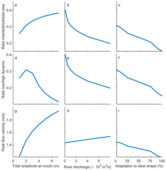 Subsequently, the cross-sectional area at the mouth is related to the tidal prism. Earlier approaches derived these relations for tidal inlets or specific tidal systems [13,15,38,39,48,49,50]. Recently, we derived an empirical relation for multiple cross-sections within 35 estuaries (supplementary material of [19]). This equation is used to estimate the cross-sectional area at the mouth:
