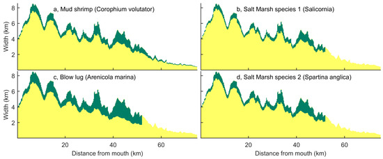 For purposes of illustration and validation, the tool was applied to the Columbia River estuary (USA), which is an example of a relatively wide valley that is partially filled with bars [26], and the Western Scheldt (NL), which is an alluvial estuary with large deviations from a converging along-channel width profile and filled with tidal bars [19,26] (Figure 2c,d). For validation, channel depth at the landward boundary was calculated in the tool with measured river discharge. Predicted velocities are validated on the Columbia River only because the regression was based on data for the Western Scheldt. Bed elevation and salinity predictions are validated on both systems. The predicted flow velocities from the tool were compared with results from numerical modelling for the Columbia River estuary [7,28] and from a calibrated hydrodynamic model of Rijkswaterstaat for the Western Scheldt (SCALWEST, [32]). Results from numerical modelling were used because field measurements of flow velocities do not provide full coverage in time and space. Salinity data were obtained from Jay and Smith [51] for the Columbia River and from de Brauwere et al. [52] and Vroom et al. [53] for the Western Scheldt. Habitat preferences for potential habitat maps were obtained from the Marine Life Information Network (MarLIN), which is a database on the biology of species and the ecology of habitats.