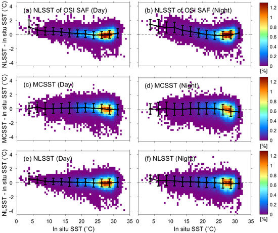 Distributions of NLSST errors of OSI SAF during the (a) daytime and (b) nighttime, MCSST errors during the (c) daytime and (d) nighttime, and NLSST errors in the (e) daytime and (f) nighttime as a function of the in situ SST (°C). The color represents the percentage of the data to the total number of matchup points in each bin; error bars represent the standard deviation of SST errors of each interval.