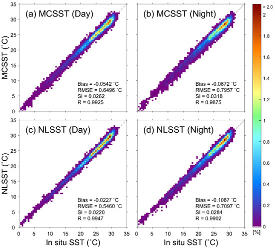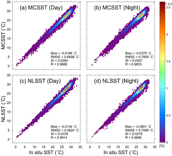 Comparison between MCSSTs and in situ temperatures during the (a) daytime and (b) nighttime and between NLSSTs and in situ temperatures at (c) daytime and (d) nighttime, where the color represents the percentage of the data to the total number of matchup points in a bin of 0.5 × 0.5 °C. Bias, root mean square error (RMSE), scatter index (SI), and correlation coefficient (R) are given in each plot.