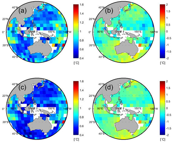 Figure 6 illustrates the spatial distribution of differences between satellite-derived SSTs (MCSST and NLSST) and in situ temperatures for 5° × 5° bin for daytime and nighttime. In some of the tropical regions, the mean bias was not calculated due to persistent cloud cover. Overall, there are biases within ±0.5 °C throughout the full-disk area except where negative biases exceeding −0.5 °C are identified at low latitudes. The satellite-derived SSTs tend to be overestimated in the seas around Australia. On the other hand, there is a small bias in the Northwest Pacific. The spatial pattern of mean bias is similar between MCSST and NLSST; NLSST (Figure 6c,d) has a smaller and uniform bias than MCSST (Figure 6a,b) during both the daytime and nighttime.