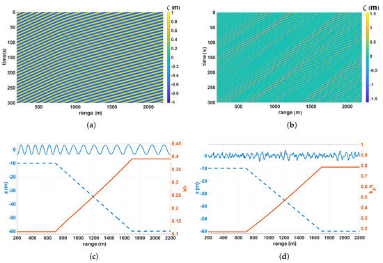 (a) Surface elevation range-time diagram for the monochromatic wave shoaling case ( Hz, m); (b) for the JONSWAP spectrum case ( Hz, m); (c) cross section corresponding to panel (a), where the wave height is enhanced by factor of 3.5 (solid blue line), bathymetry profile according to Equation (A3) (dashed blue line), and corresponding dimensionless wave number (solid orange line); (d) the same as (c) for the JONSWAP spectrum case of panel (b). The values of () correspond to intermediate-shallow water depth conditions. The time-space crest slopes change in diagrams (a,b) after entering shallow waters, which corresponds to changes in their celerity.