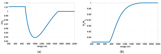 It is important to note that all imaging mechanisms are range dependent as they use the local incident angle in their definitions. In coastal probing, this angle changes significantly within the radar footprint. To ensure the requirement of working in the far zone in the modeled sea clutter image, a constant range offset of m is added. Finally, the range trend due to the radar equation is added using Equation (10).