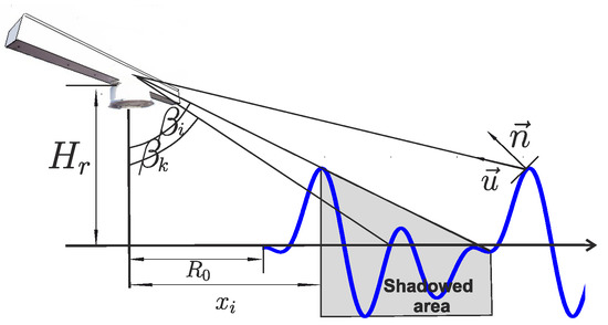 There are several ways to calculate the shadowing mask for a given realization of the surface elevation and probing geometry. For a discretized sea surface, an approach based on the comparison of the local incidence angles is employed. For a given realization of the surface elevation , the local incidence angles are defined as , where is the radar installation height. Then, for a fixed time instance , the shadowing condition depicted in Figure 4 is applied to each range point . If, for any point , the condition is satisfied, the corresponding surface point is marked as shadowed using an indicator (shadowing mask):