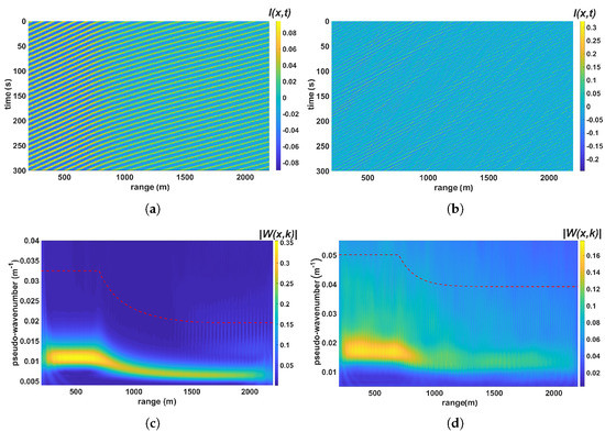 (a) Range-time diagram of the detrended radar image intensity for the monochromatic wave case given in Figure 1a (noise level , radar height = 50 m); (b) the same as panel (a) for the JONSWAP spectrum case given in Figure 1b. The intensities are presented in relative values. Negative values in the intensities appear as a result of image range detrending after the radar equation application. (c,d) Corresponding averaged wavelet spectra of the radar images (a,b) respectively. The red dashed lines mark the low-pass (LP) filter boundary. For the monochromatic wave case in the wavelet spectrum (c), the second harmonic manifestation due to the imaging mechanisms is evident in the stripe m.