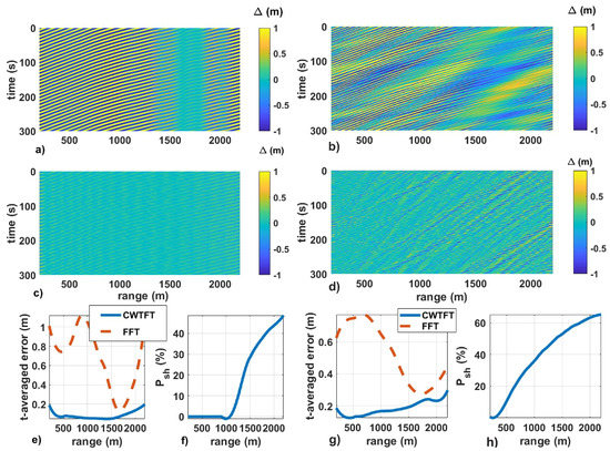 Range–time diagram of the differences between the original and reconstructed images () for the monochromatic wave case (a) with the conventional method and (c) with the new CWTFT-based method; (e) range dependence of the time-averaged absolute error for both methods, and (f) corresponding shadowing probability. (b,d,g,h). The same is shown for the JONSWAP spectrum case. The algorithm for the utilization of the conventional method in 1D case is given in Appendix B.