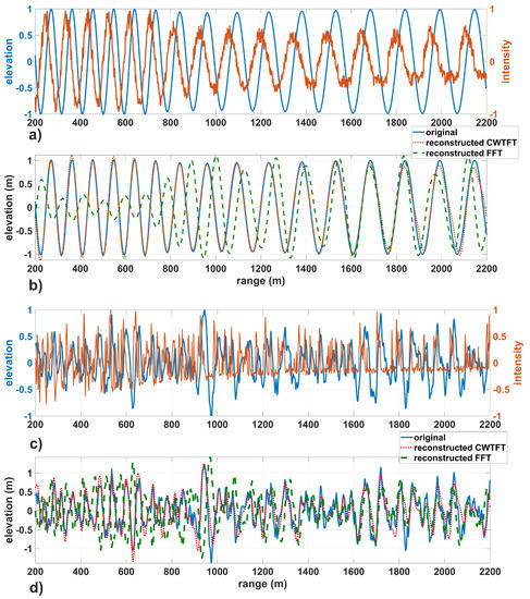 Since the Fourier transform based CWT is used, the first and last 200 m in the reconstructed image are not taken into account in the estimation of the error statistics (summarized in Table 2) in order to disregard edge effects. A comparison between the original and reconstructed instantaneous surface elevation profiles is presented in Figure 8. The corresponding statistical parameters are given in the last three columns of Table 2, showing a high correlation between the original and reconstructed signals on the section with a comparatively small mean error and dispersion. Unlike the conventional method, the results of the present method demonstrate a very high correlation between the original and reconstructed surface elevations. The speckle noise, which is clearly seen, especially in the shadowed troughs on the cross-section of the corresponding radar images (orange curves in Figure 8a,c), is filtered out in the resulting image due to the use of the corresponding LP filter in the wave number-coordinate domain. The present method also grasps the individual wave heights and crest/trough locations significantly better.