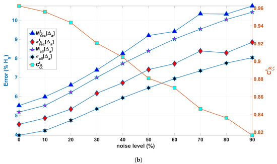(a) Main statistical parameters of the absolute error with respect to the corresponding shadowing probability (represented by the radar installation height ) are summarized as percentages of the significant wave height. The results are additionally averaged over the nine bathymetry profiles and three JONSWAP spectra. (b) The same is shown for the noise level dependence. The radar installation height was 230 m (almost no shadowing conditions) for this set of experiments.