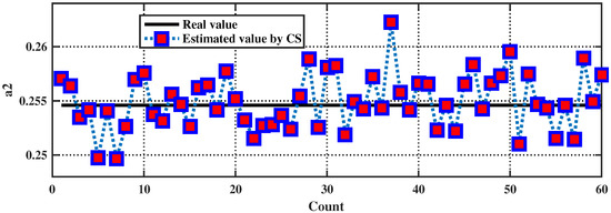 Estimated value of a2 from B1 obtained by executing the CS algorithm 60 times for numerical experiments. The average value (AVG) is 0.2553, and the standard deviation () is 0.0025.