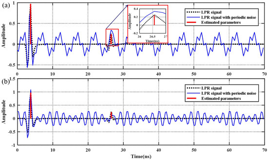 LPR data with periodic noise and parameters estimated by the CS algorithm. (a) The frequencies of the sine interference are 200 and 800 MHz; (b) the frequencies of the sine interference are 450 and 550 MHz).