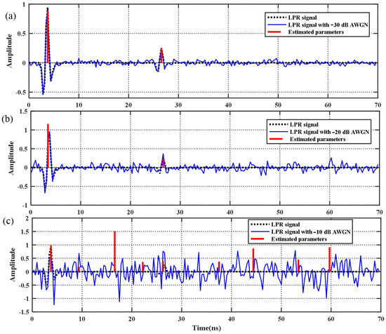 LPR data with Gaussian noise and the parameters estimated by the CS algorithm. (a) Noise level: −30 dB; (b) noise level: −20 dB; (c) noise level: −10 dB.