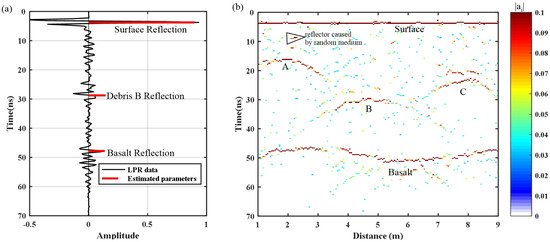 (a) A single trace in 5 m (red line in Figure 7b) and the parameters estimated by the CS algorithm. (b) Image of the estimated absolute amplitudes of the simulated LPR profile.