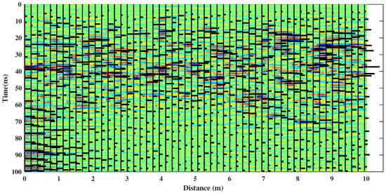 Figure 7a is a snapshot of a radar wave in 28.8 ns at 5 m. The distortion of electromagnetic waves passing through random inhomogeneous media is clearly visible. Figure 7b shows the forward simulation result with direct waves removed. In the simulated LPR data image, the response of the strongly-reflecting debris is mixed with the response of weak reflectors in a random medium. The parameter values were estimated by the CS algorithm using 30 random Fourier series in B1 (400–600 MHz). Figure 8a is a single trace at 5 m (red line in Figure 7b) and the amplitudes and the time delays estimated by the CS algorithm. The CS algorithm not only accurately estimates the time delays () of a strong reflection response, but also restores the amplitudes (). Figure 8b is the color image of absolute amplitudes (). Compared to the original LPR image (Figure 7b), responsive recognition is greatly improved. According to the amplitude’s absolute value, the reflected response signal can be located and identified. Moreover, some LPR responses of small debris in random inhomogeneous media are available. One can identify some complete weak responses based on the continuity of the amplitude to enrich the interpretation process.