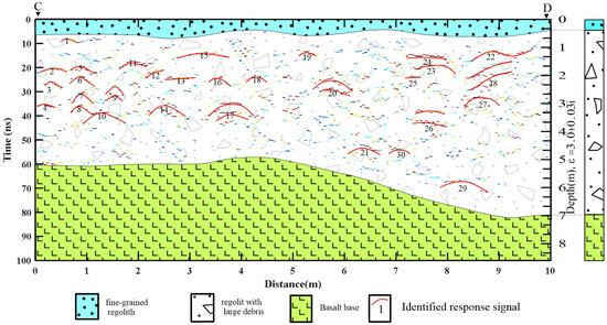 When combining the forming mechanism of the regolith in the study area with the result of the CS-based approach, a further interpretation of the LPR data was revealed (Figure 14). A dielectric permittivity of 3.0 + i0.03 was used to calculate the depth. In the LPR data image, a three-layer structure could be clearly delimited as follows.