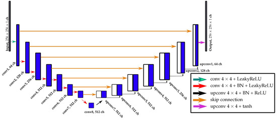 Schematic overview of the proposed U-Net architecture. Each convolution operation has a kernel of size with stride 2. For up-sampling, the transposed convolution operations with kernels of size and stride 2 are used. The Leaky ReLU activation function in the encoder part of the network has a negative slope of 0.2.
