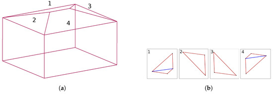 An example of CityGML building model representation and triangulation of its roof surfaces. (a) CityGML building model representation; (b) roof surface triangulation.