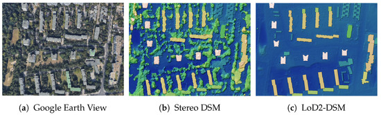 The first dataset consisted of a spaceborne stereo DSM and a LoD2-DSM. The LoD2-DSM was generated with a resolution of 0.5 m from a CityGML data model that is freely available on the download portal Berlin 3D (http://www.businesslocationcenter.de/downloadportal). The process of this type of DSM generation is given in Section 3.3.