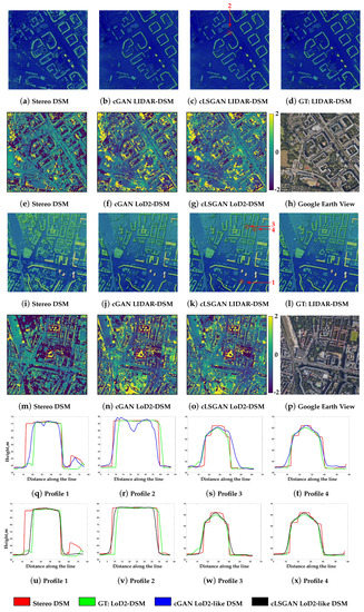 By investigating the profiles of selected buildings highlighted by red lines in Figure 5c,k and Figure 6c,k for LoD2-DSM and LIDAR-DSM datasets, respectively, we can confirm that, in general, both cGAN and cLSGAN models can successfully learn 3D building representations that are close to the ground truths (green profiles). However, as it was mentioned before, some artifacts exist on the height images generated by the cGAN model. This is not dependent on the data type as both obtained results from LoD2-DSM and LIDAR-DSM datasets have this problem. Examples are demonstrated in Figure 5r for LoD2-DSM and in Figure 6k,r for LIDAR-DSM. Fortunately, the application of the cLSGAN model helped to smooth the artifacts and bring the shape of building even closer to the ground truth shapes. This achievement is clearly seen in Figure 5v and Figure 6u,v. Of course, not every building in the generated results exhibited holes. The demonstrated bad examples were chosen for the visual notion. Moreover, not only the quality of flat roofs was improved. The gable, hip, or any other roof type consisting of inclined planes can be improved by applying our methodology. As can be seen from the profiles (Figure 5w,x and Figure 6w,x), the cLSGAN model provided much better results. The planes of roof surfaces are much smoother and more symmetrical regarding the central ridge line. Primarily, the ridge lines are much sharper in comparison to ridge lines from the stereo DSM and are at the central position which gives a more realistic view and is geometrically more correct. Additionally, all profiles show very close resemblance to the ground truth shapes, especially regarding the width and borders of the buildings.
