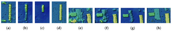 Without re-training the model on the new dataset, we directly generated the Munich elevation image by passing WorldView-2 data through the DSM-to-LoD2 network trained on LIDAR-DSM and LoD2-DSM. The pixel examples of generated height images from both data types are illustrated in Figure 9b,c,f,g, respectively. From the resulting 3D height images, it can be seen that the proposed model successfully managed to generate the 3D elevation constructions over a new area. As expected, no new buildings were generated. However, some buildings were only partially reconstructed using both models. In example 1 of LIDAR-DSM in Figure 9b and LoD2-DSM in Figure 9c, the highlighted building was only partially reconstructed on both datasets. From the zoomed version of the highlighted buildings in Figure 10, we can clearly see that the quality of both input buildings from the stereo DSM is quite low—not regular and very noisy. The shape of the first building (see Figure 10a) is not consistent, and the ridge line has a form close to a zigzag. The second building in Figure 10e is most probably surrounded with vegetation and, due to interpolation processes, resulted in an object with irregular form. Even for the human eye, it is difficult to say if this object is a building. Therefore, both models experienced problems with these buildings, which confirms our theory of bad quality data influence. The solution here could be to use an additional information like spectral images during the training, which is very useful for object detection and classification tasks.