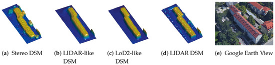 By investigating the presented profiles, we noticed that the roof shapes were improved by applying both models—the ridge lines are sharper and appear much better now compared to the stereo DSM. Comparing the roof profiles between LIDAR-DSM (third line in Figure 9) and LoD2-DSM (fourth line in Figure 9), a small improvement in ridge line sharpness was produced with the LoD2-DSM model. Regarding the wall steepness, the buildings generated by the LoD2-DSM model are close to perpendicular wall planes in contrast to the one generated by applying the LIDAR-DSM model. This is reasonable, as the LIDAR-DSM was rasterized from a point cloud using interpolation and, as a result, features smooth transitions from the roof to the ground.