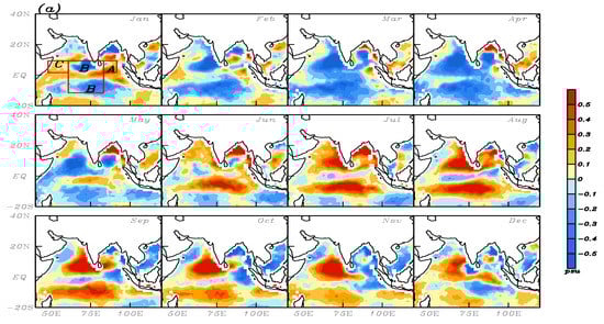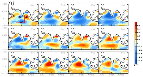 The SSS difference between the Arabian Sea and the Bay of Bengal, which is significant in climatological SSS distribution [28], was not found in monthly SSSAs. However, changes are apparent in several SSSAs maxima and minima centres shown by the Aquarius data (Figure 1a). For instance, in January, a positive SSSA centre appears in the eastern part (AEIO), a negative SSSA centre in the central part (BCIO) and a positive SSSA centre in the western part (CWIO), depicted in Figure 1a, respectively. From boreal winter to spring, the BCIO continuously intensifies and expands its area, whereas both the AEIO and CWIO diminish and disappear. In April, negative SSSAs distribute over almost the whole Indian Ocean. A notable change can be seen in May, with positive SSSAs slightly to the south of the equator, which may represent the suddenly intensifying AEIO. This positive SSSA, emerging as an elongated spatial feature (ESF), divides BCIO into two separated regions. Later, the positive SSSA ESF dominates almost the whole equatorial Indian Ocean and connects up with the intensifying CWIO in the northern Indian Ocean. Subsequently, the BCIO disappears during the boreal summer monsoon period with the positive SSSAs controlling the whole Indian Ocean, except for the equator and the western coast of the Arabian Sea. In the autumn, the positive SSSAs begin to dissipate gradually and the boreal winter mode is restored in December. This annual cycle of SSSAs also emerges when employing long-term SSS data obtained from Argo data for the period 2005–2014 (Figure 1b). Sparse subsampling of Argo data can reproduce the main features of the annual cycle defined by the satellite SSS from Aquarius.