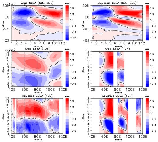 Time-latitude diagrams (a) of SSSAs between E and E and hovmöller diagrams (b) of SSSAs along the area of 10S and 10N in Argo and Aquarius (Unit: psu, the dashed lines enclose the SSSAs ESF areas).