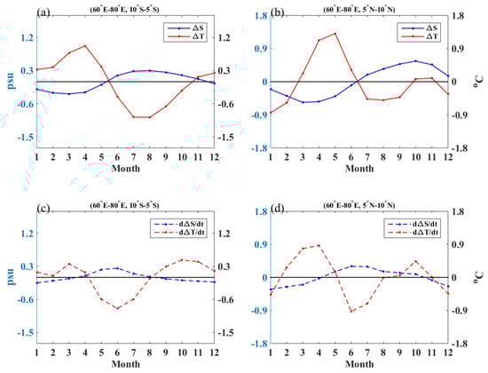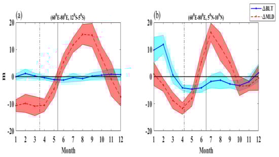The earlier changed SSSAs may affect the oceanic stratification and, in turn, trigger a response in atmospheric circulation. To investigate this process, we show the seasonal variabilities of MLD and BLT anomalies in Figure 5. The top layer is the MLD which is defined as the depth that has a density change of 0.03 kg/m3 from the surface. In the SD area, the MLD anomalies change in the middle of May and are associated with the change of SSSAs and SSTAs (Figure 3a). BLT is the difference between an isothermal layer and the isopycnal MLD, insulating the surface from the deeper layers. Thereby, BLT has influences on the SST by controlling the vertical mixing [46,47]. In the SD area (Figure 5a), the change of BLT anomalies is more sensitive to the tendency of SSSAs rather than the seasonal variability of SSSAs (Figure 3c). When the tendency of SSSAs increase to positive in early March, the BLD anomalies begin to decrease below zero and vice versa. According to the calculation of BLT (in Section 2) and given the slightly decreasing MLD anomalies (Figure 5a), in the southern Indian Ocean, decreasing BLT anomalies are attributed to upwelling. Then, upwelling eats away at the BLT leading to more cold and salty water entrained into the mixed layer. When MLD anomalies increase in April, SSTAs begin to be affected by this upwelling process (the tendency of the SSTAs decrease below zero as shown in Figure 3c). In the northern Indian Ocean, things respond a little differently (Figure 5b). Although BLT and MLD also change in March, the tendency of SSSAs changes in April. We assume that this is because of the strong salty surface water in the Arabian Sea, so it needs more time for upwelling to affect the SSSAs. With the increasing SSSAs, the significantly decreasing BLT brings more subsurface water into the mixed layer, which in turn, promotes the decrease of SSTAs. As such, SSSAs has the potential ability to affect SSTAs through shoaling the BLT.