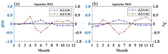 The seasonal variability of SSSAs is different from that of SSTAs, presenting not only in the trend of changing [when SSSAs increase, corresponding SSTAs decrease (Figure 3)] but also in the time of changing. Specifically, in the southern Indian Ocean, the tendency of SSSAs increases in the middle of March and that of SSTAs decreases in the early April. In the northern Indian Ocean, the tendency of SSSAs increases in the early April and that of SSTAs decreases in the early May. In other words, SSSAs have one and a half cycle/yr while SSTAs have one cycle/yr. Thus, SSSAs change faster than SSTAs. To give more convincing evidence of the quick change of SSSAs, we also calculated the seasonal variation in SSSAs and SSTAs for individual years with the Aquarius SSS dataset (Figure 4). Remarkably, the change of SSSAs tendency precedes that of SSTAs even in the individual years, except for 2013 (figure not shown), when the MJO (Madden Julian Oscillation) is very active during the onset of the SASM [45], resulting in heavy precipitation inhibiting SSSAs increase.