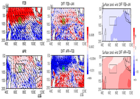We analysed next the atmospheric circulation anomalies before and after the SSSAs change to better understand the variability of SSSAs. On the one hand, freshwater flux is stressed to play a crucial role in the seasonal variability of SSS in the Indian Ocean [12,19]. Figure 6 shows the distributions of freshwater flux anomalies in February and April respectively. Before the SSSAs change (February), there is more precipitation over the SSSA ESF area, while less freshwater goes into the SSSA ESF area after the SSSAs change (April); instead, strong evaporation anomalies make this area much saltier. On the other hand, the upwelling effect on the variability of SSSAs can be found in the entrainment circulations before and after the increasing SSSAs (Figure 7). The wintertime north-westerly wind anomalies intensify in the southern Indian Ocean before SSSAs change and weaken after SSSAs (Figure 7a). In the southern Hemisphere, negative curl corresponds to cyclonic curl and relative upwelling. Thereby, before the SSSAs change, the positive wind stress curl anomalies over the SSSAs ESF area, represent Ekman downwelling. After the SSSAs change, the negative wind stress curl anomalies induce Ekman upwelling in the SSSAs ESF area (Figure 7b). Furtherly, due to the negative wind stress curl anomalies in the north of 10S and the positive ones in the south of 10S before the increasing SSSAs (Figure 7b), corresponding to anticyclone in the north and cyclone in the south, the easterlies is strengthened (Figure 7c), which in turn, provides a favourable environment for upwelling in the eastern Indian Ocean. The mode of wind stress curl change after the SSSAs increasing, with positive anomalies in the north and negative in the south, leading to anomaly westerlies (Figure 7c). In March, the SSSAs increase just as the atmospheric circulation pattern begins to change into the SASM pattern and the thermocline in the SD starts to shoal as a result of weakened downwelling [44].
