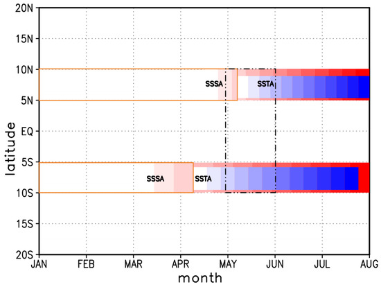 In summary (Figure 8), in the SD (S–S) from January to the early April, SSTAs stay in an increasing state (orange rectangle), while SSSAs start to increase in the middle of March (red filled rectangle), which is due to the less freshwater and Ekman upwelling caused by the wind stress. Thus increasing SSSAs, accompanied by the decreasing BLT anomalies, help to create a favourable environment for the SSTAs to decrease in the coming month via strengthening the upwelling. In other words, SSSAs, as one component in the ocean, are more sensitive in responding to the atmospheric influence than SSTAs. This phenomenon can also be found in the symmetrical area of the northern Hemisphere (N–N). One should mention here that there exist time-lags between the southern and northern Hemisphere, which leads to significant SST gradient in May (black rectangle). Thus, this heat contrast promotes the ITCZ to move northward and contributes to the change of vertical circulation.