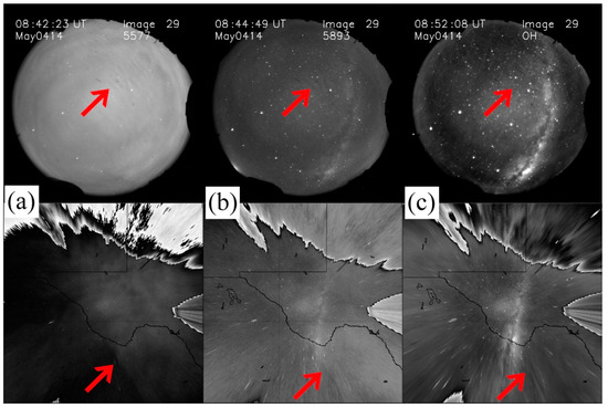 - Brown, L.B.; Gerrard, A.J.; Meriwether, J.W.; Mekela, J.J. All-sky imaging of mesospheric fronts in OI 557.7 nm and broadband OH airglow emissions: Analysis of frontal structure, atmospheric background conditions and potential sourcing mechanisms. J. Geophys. Res. 2004, 109, D19104. [Google Scholar] [CrossRef]