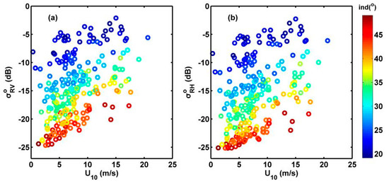Simulated compact-polarimetry (CP)-polarized normalized radar cross-sections (NRCSs) vs. in situ buoy-measured U10: (a) right circular-vertical (RV) polarization; (b) right circular-horizontal (RH) polarization.