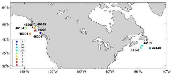 Distribution of buoy locations used in this study. We indicate the number of synthetic aperture radar (SAR) images overlaying the respective buoys in the legend.
