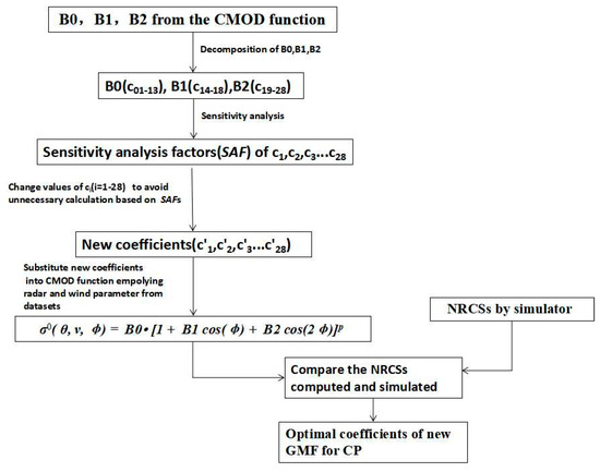 Flowchart for building the CoVe-Pol model through adjustment of the C-band geophysical model function (GMF) model series (CMOD) coefficients obtained by application of a sensitivity analysis.
