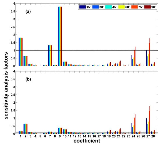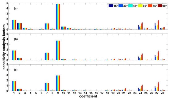 The mean sensitivity factors vs. coefficients: (a) radar incidence angle is 25 degree; (b) radar incidence angle is 35 degree; (c) radar incidence angle is 45 degree. The colors represent different wind directions (15°, 30°, 45°, 60°, 75°, 90°).