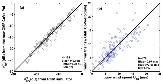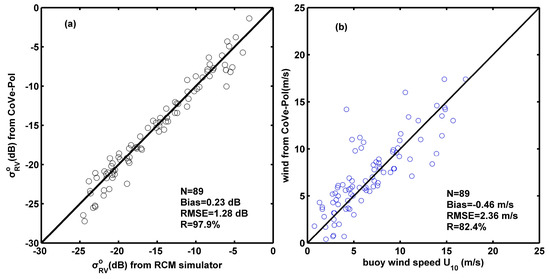 Comparisons of: (a) RV-polarized NRCSs between RADARSAT Constellation Mission (RCM) simulated data and results computed by the new compact RV polarization GMF; and (b) SAR-retrieved wind speeds from CoVe-Pol model and data measured by buoys.