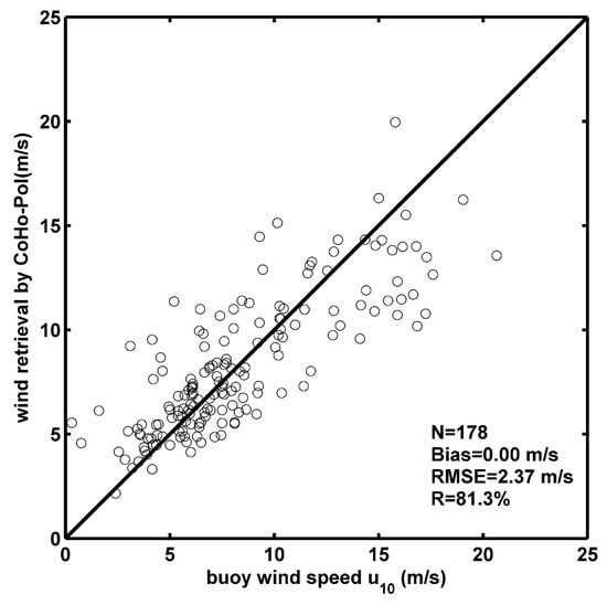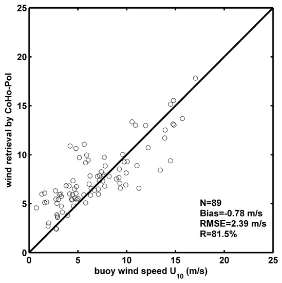 Comparing the retrieved wind speeds and the buoy observations, the RMSE for winds retrieved by the CoHo-Pol model is 2.39 m/s, and the correlation coefficient is 81.5%, which is shown in Figure 10.
