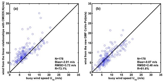 The comparsion of wind speed estimation results between using the linear realtionships with CMOD5.N and using CoVe-Pol model: (a) wind speed estimation through the linear relationships with CMOD5.N vs. wind speed measured by buoys; (b) wind speed retrieved by CoVe-Pol model vs. wind speed measured by buoys.