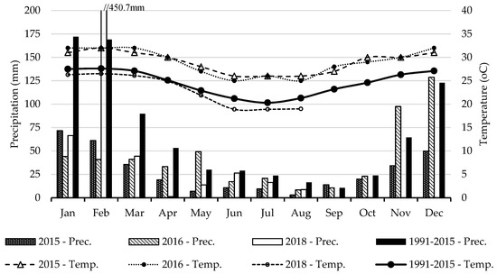 Average monthly precipitation (Prec.) and temperature (Temp.) for the three years of data collection (2015, 2016, and 2018) and comparison with a reference period (1991–2015) [23].