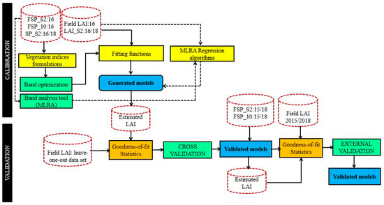 Similarly to the VIs, the MLRA algorithms were evaluated using the three types of data: Hyperspectral dataset (FSP_10), multispectral dataset (FSP_S2), and Sentinel-2 data (SP_S2). The FSP_10 and FSP_S2 were correlated only to the field leaf area index (Field_LAI) and the SP_S2 was correlated to both the Field_LAI and Sentinel-2 LAI product (LAI_S2). Table 4 presents the MLRA evaluated in the present study and the modelling process is presented in Figure 3. Prior to the application of the MLRA algorithms, an analysis of the best number and combination of bands for estimating the LAI using the different datasets was performed based on the band analysis toolbox. The algorithms were also implemented on the MLRA toolbox [17] of the software Automated Radiative Transfer Models Operator (ARTMO).