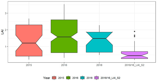 Boxplot of the field LAI for the three years: 2015 (n = 40), 2016 (n = 137), 2018 (n = 23), and derived from sentinel products, 2016/18_LAI_S2 (n = 22).