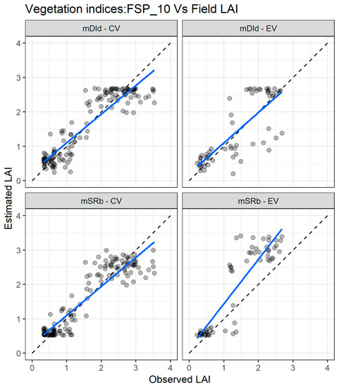 Figure 6 presents the agreement between the LAI measured and estimated with FSP_10 using the mSRb and the mDId for the cross validation and external validation datasets. For the cross-validation dataset (Figure 6 left panel), the two indices exhibit good matching in the whole range of LAI values, but there is an underestimation for values greater than three. For the independent validation dataset (Figure 6 right panel), the two VIs estimate well the lower values of LAI, but for values above one, the estimation is poorer with an underestimation for the mDId and an overestimation for the mSRb.