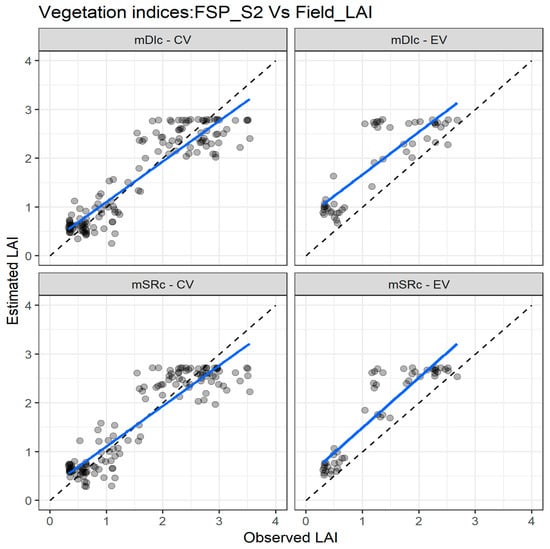 Comparisons of the measured and estimated LAI with the two best performing spectral vegetation indices using the FSP_S2 dataset for both cross validation (CV) and external validation (EV) datasets. mSR—modified simple ratio; mDI—modified difference index. The full line depicts the linear regression and the dashed line the linear regression through the origin.