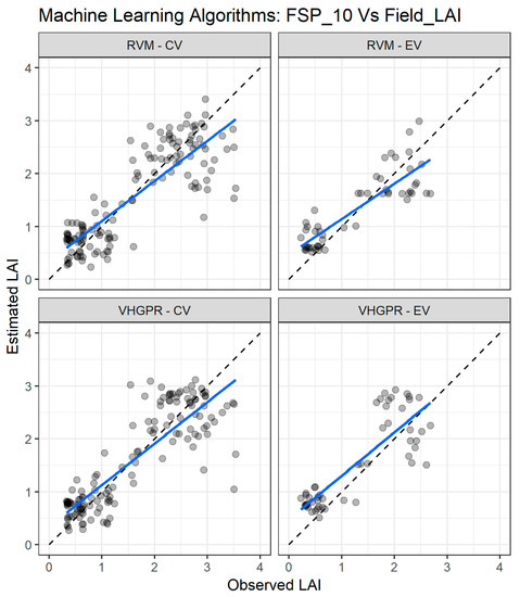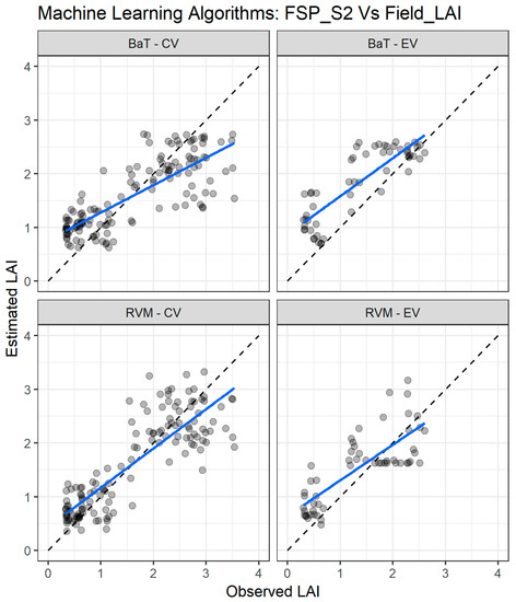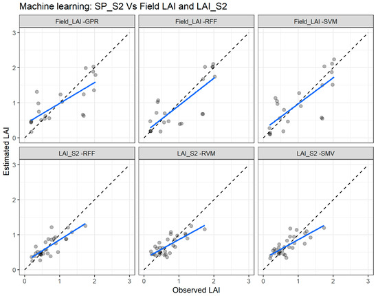 Figure 8 depicts the agreement between measured and estimated LAI for the cross validation with the two combinations: SP_S2 vs. Field_LAI (upper panel) and SP_S2 vs. LAI_S2 (lower panel). Clearly, the SP_S2 vs. LAI_S2 combination presents better agreement with the measured and estimated LAI.