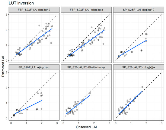 To perform an LAI retrieval through RTMs, one need to first build up a look-up-table (LUT), which is a database of simulated canopy reflectance and their corresponding set of input parameters. Afterwards, an inversion technique is applied to search and identify the parameters’ combination that yields the best fit between the measured and LUT reflectance [18,56].