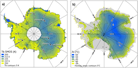 The physical temperature of ice is a critical input of our method, and is provided by the GRISLI 3D ice-sheet thermodynamical model. Version 2.0 of GRISLI benefits from recent improvements concerning the computation of ice flux at the grounding line and a proper description of basal hydrology [44]. Snow and firn are accounted for by considering a weight-equivalent ice slab. The climate parameters forcing the model over time include surface temperature, surface mass balance, basal melt under ice shelves, and sea level (more details in Quiquet et al. (2018) [44]). The accuracy of the final temperature field mainly depends on the geothermal flux at the base of the ice sheet. Several datasets of geothermal flux are available, and the one of Fox-Maule et al. (2005) [17] gives relevant results (Section 2.3). Just as Macelloni et al. (2016) [10], surface temperature () is computed from a temporal average of the Crocus snow model [45], forced by ERA-Interim reanalysis [46] over the 2000–2012 period (Figure 1b). This product was shown to compensate a warm bias in ERA-Interim, compared to the MODIS measurements under clear-sky conditions [47].