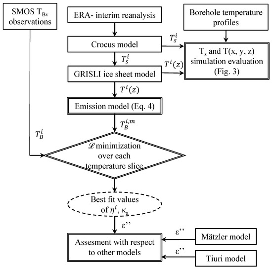 Previous studies explored the first two hypotheses by considering either or more permittivity models as valid [10,23,26,34]. The aim of our study is to explore the last two hypotheses in particular. A method to retrieve absorption and emissivity at a continental scale from SMOS observations is elaborated here. Figure 2 illustrates the flowchart describing the paper methodology: observations and models are introduced in Section 2.1 and Section 2.2, and simulation evaluations are performed in Section 2.3. A simple emission model was applied to retrieve absorption and emissivity in every pixel by minimising an adapted Lagrangian function (Section 2.4.1). Best-fit values were then used to estimate the imaginary part of permittivity, which was compared to existing permittivity models.