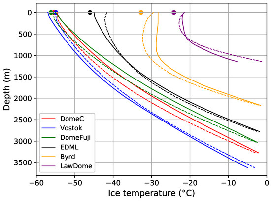 - Hondoh, T.; Shoji, H.; Watanabe, O.; Salamatin, A.N.; Lipenkov, V.Y. Depth–age and temperature prediction at Dome Fuji station, East Antarctica. Ann. Glaciol. 2002, 35, 384–390. [Google Scholar] [CrossRef]