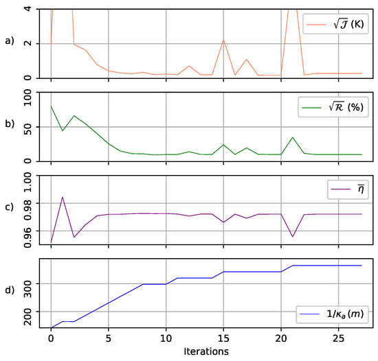 Evolution of: (a) the square root of cost function (K), (b) correlation function , (c) mean emissivity , and (d) e-folding depth (m) along the iteration steps of the retrieval process. Temperature slice: between and C in East Antarctica.